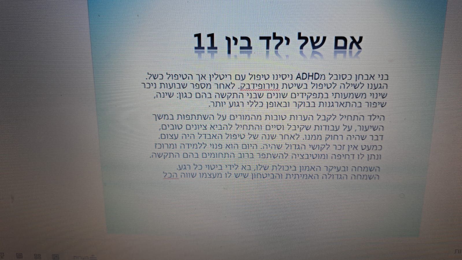 שאנחנו החלטנו לקחת פעם בשבוע ולא פעמיים בשבוע כדי לא להכביד עלינו מבחינת כספית). היה שווה כל שקל. דוד השתנה בכל נושה הקשב, רואים שפור משמעותי גם בבית וגם בבית ספר. בתקופה שלא היה אפשר לעשות טיפול בחופש מסוים כבר ראינו את ההבדל אך זה בלי טיפול ואך זה בלי, אז