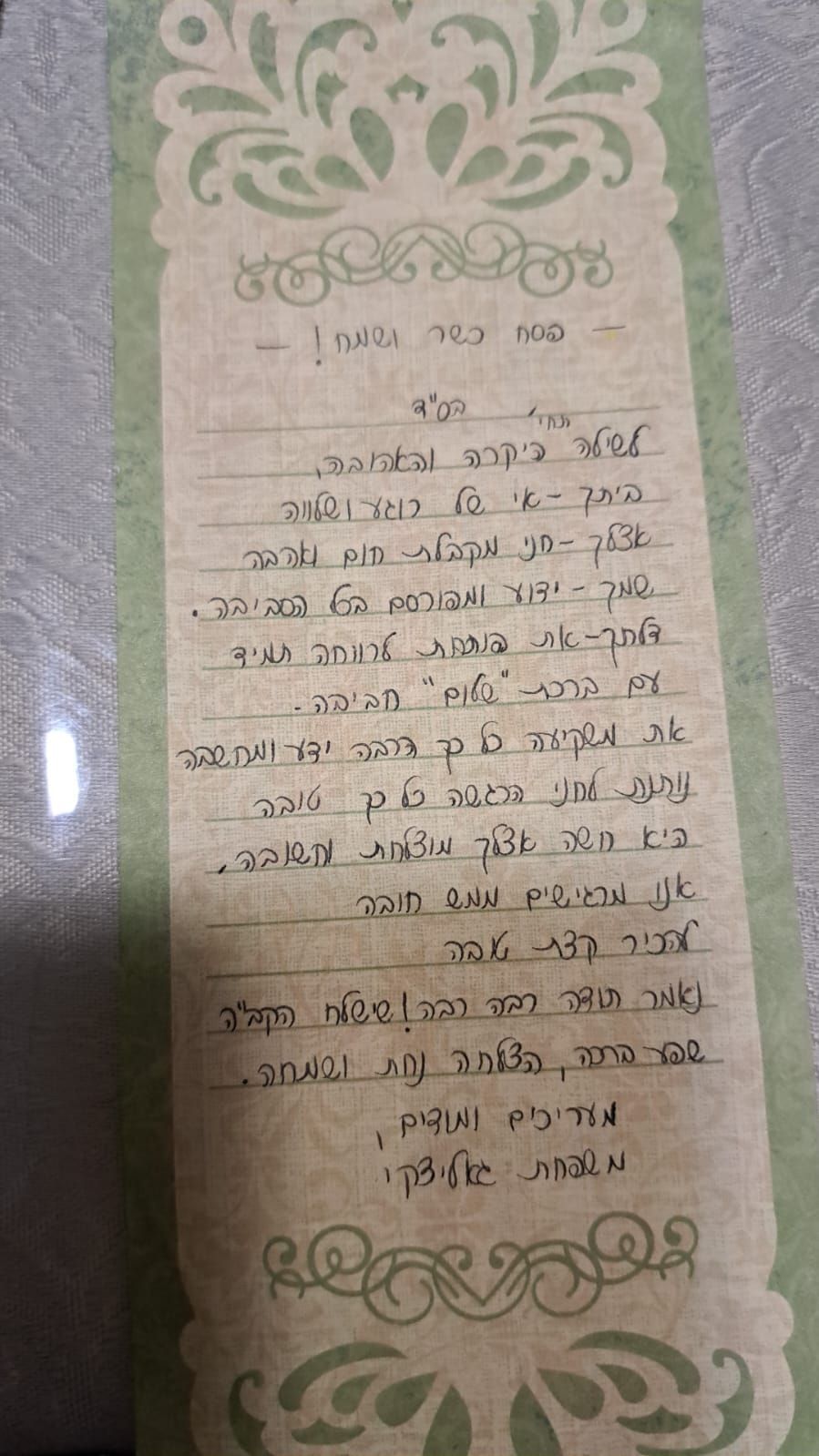 ושוב מסתיימת שנה ואנחנו נפרדים, שנה מלאה הספקים והישגים, שנה בה נתת כלים חדשים, הטבעת בנו חותם להמשך החיים. תודה על סבלנות ללא גבול, תודה על שעזרת לנו לקצור יבול, תודה על עוד שלב שעלינו בזכותך, תודה על שהיית איתנו כל כולך. רצינו לברך ברוב הצלחה, ברכת השם בביתך תהיה שרויה, תימלא דרכך באושר וברכה, ומילוי משאלות ליבך לטובה.